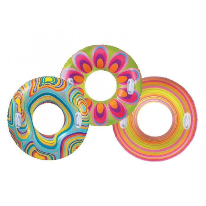 Bring these Transparent Tubes anywhere and everywhere! They come in a small box so they are easy to take on vacation and to pool parties. At 38 in. diameter, everyone can enjoy floating with these unique and vibrant designed tubes. Hold on tight to the heavy-duty and easy grip handles and watch the water float on by right through the transparent and durable 10 gauge vinyl. At these low prices, color and style are not selectable.